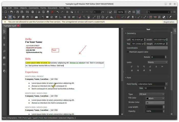 • Edit Text – Click the selection where you want to edit, then, you can change the text, add highlight color, resize, re-arrange, change text font, add underline, strikeout, etc.
