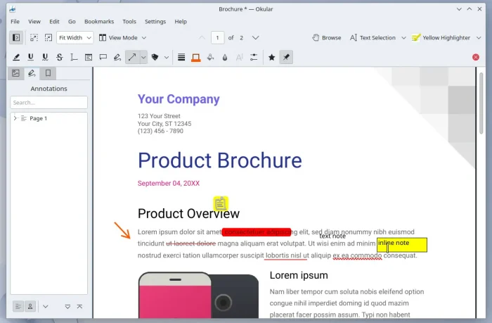 • Add inline note, pop-up note, arrow, shapes, freehand lines.