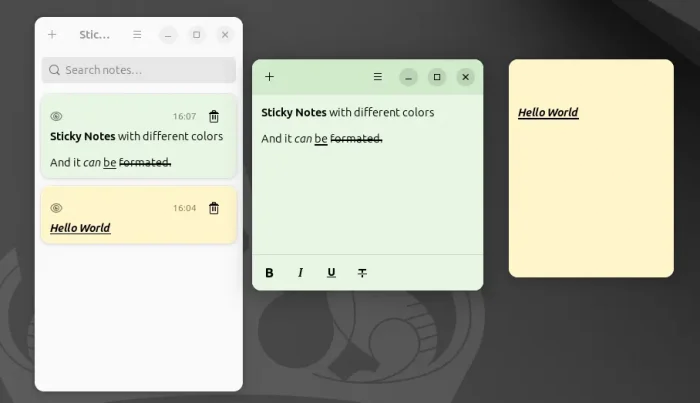 It provides 8 background color options for each note window. All the colors have dark variants that apply automatically when you switch the GNOME desktop to Dark style. And, notes are restored on every app starts, until you delete them.