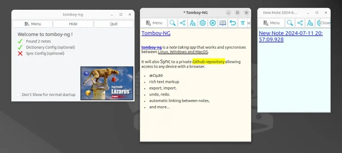 The app window looks not so good in today’s Linux desktop, but it has core features that other apps do not have. They include import and export (plain text, RFT, MarkDown), and sync with either Free Sync or private Github repository.