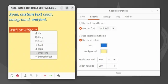 Like most other apps, it has the basic features to format text to Bold, Italic, Underline, Strikethrough, supports undo/redo, copy to clipboard, paste from clipboard, custom font, color, and system tray applet.