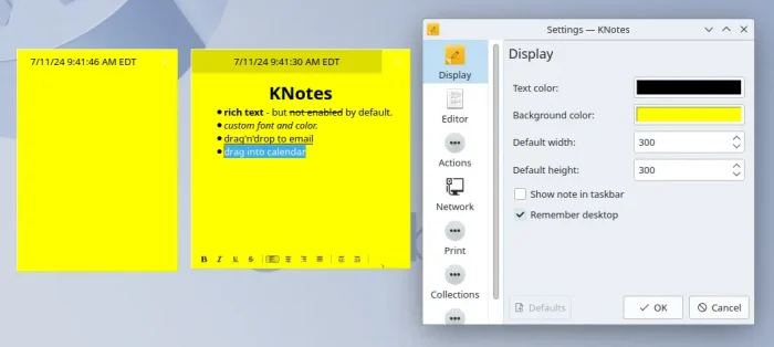 Like GNote, KNotes is available in most Linux system repositories. Just install it via your system package manager and enjoy!