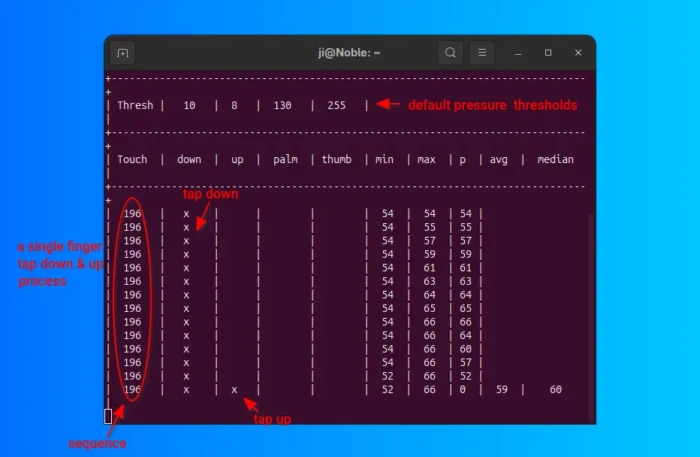 Now start tapping on your touchpad with single finger. It will print the interactive values in terminal output. When tap DOWN/UP detected, it will display x in the corresponding columns.