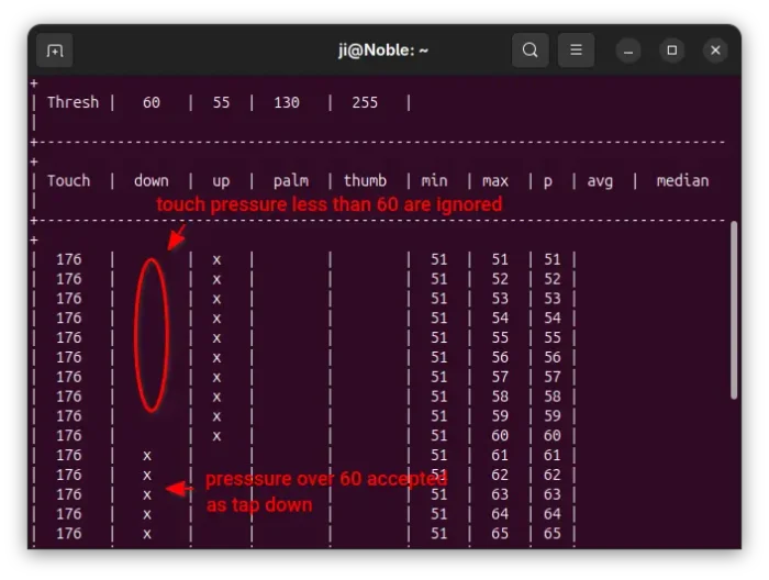 sudo libinput measure touchpad-pressure --touch-thresholds=60:10 --palm-threshold=100