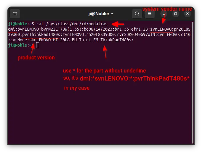 In my case, vendor name is LENOVO and product version is ThinkPadT480s. So, the dmi modalias can be described as dmi:*svnLENOVO:*:pvrThinkPadT480s*