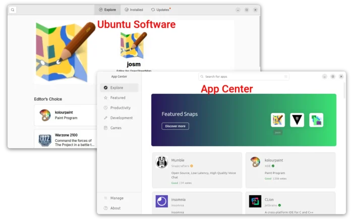 As you know, Ubuntu switched to App Center since 23.10. While, the old Ubuntu Software is still in use for Ubuntu 22.04 and 20.04. And, both are Snap Store.