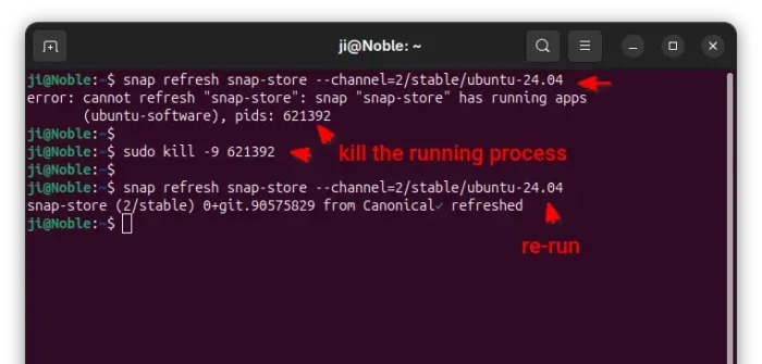 If the command failed and showed you “snap-store” has running apps, then kill the app according to the PID number in terminal output: