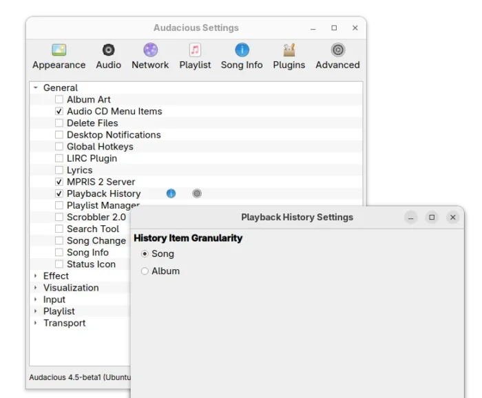 First, Audacious 4.5 introduced new Playback History plugin for the Qt UI. The plugin can track and store the history entries in history, and delete automatically on app exist.