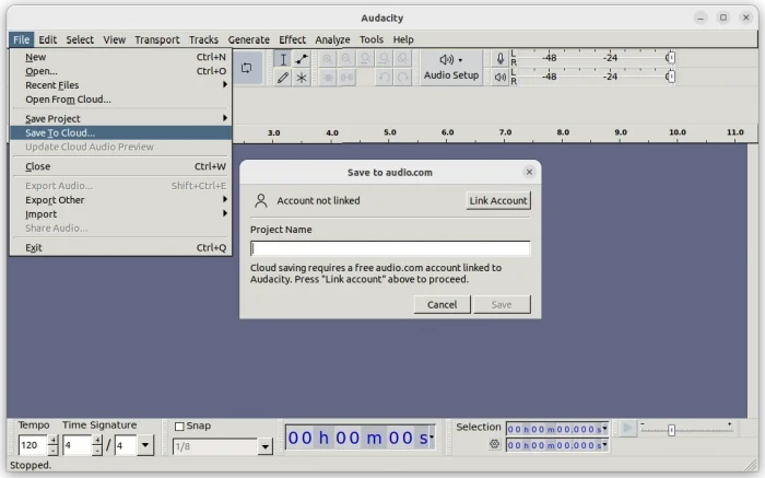 Audacity 3.5.0 is a major release with new features. They include a new cloud-saving feature. By going to menu ‘File -> Save To Cloud …’, user can save Audacity project to audio.com via a free account. So, user can access the project from any other devices, and/or share and collaborate with others.