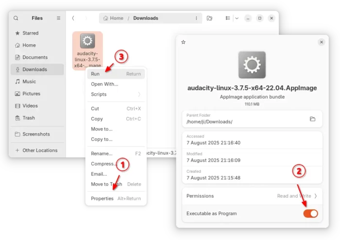 Option 1. AppImage. For Linux, it’s a non-install AppImage (for modern AMD/Intel only), that can be run directly (after added executable permission) to launch the audio editor: