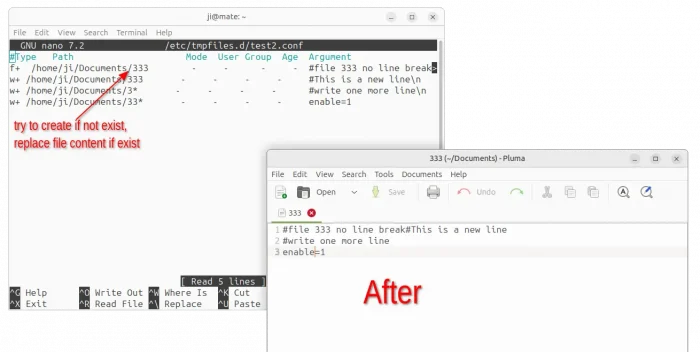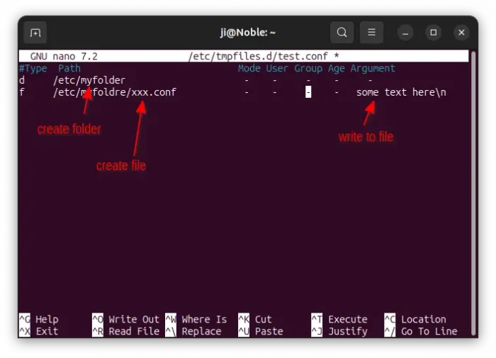 #Type Path Mode User Group Age Argument d /etc/myfolder - - - - - f /etc/myfolder/xxx.conf - - - - some text here\n