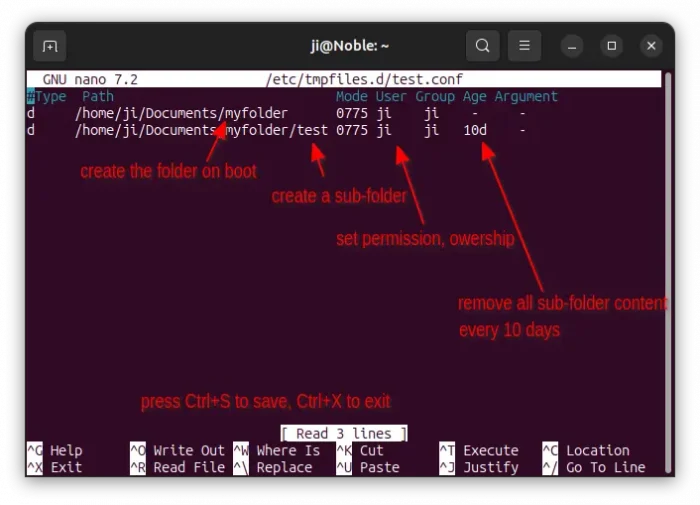 #Type Path Mode User Group Age Argument d /home/ji/Documents/myfolder 0775 ji ji - - d /home/ji/Documents/myfolder/test 0775 ji ji 10d -