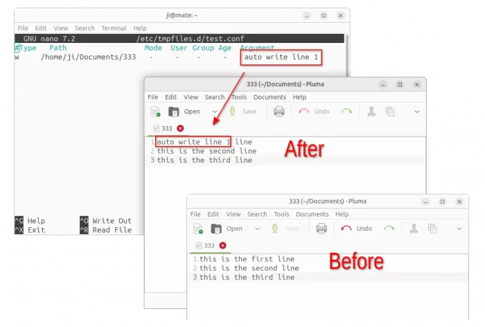 #Type Path Mode User Group Age Argument w /home/ji/Documents/333 - - - - auto write line 1