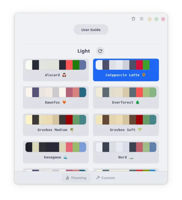 The custom colors can be saved as preset for either light or dark mode, then apply at any time from the “Theming” tab.