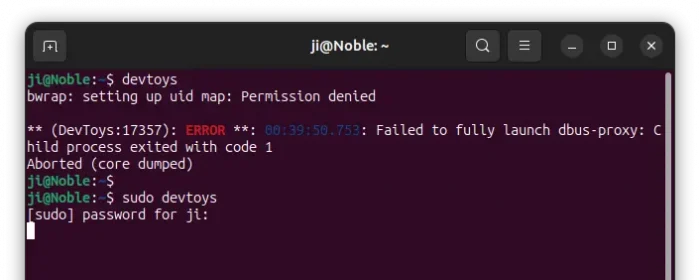 bwrap: setting up uid map: Permission denied ** (DevToys:17289): ERROR **: 00:35:39.254: Failed to fully launch dbus-proxy: Child process exited with code 1 Aborted (core dumped)