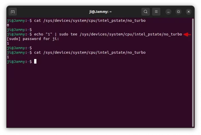 echo "1" | sudo tee /sys/devices/system/cpu/intel_pstate/no_turbo