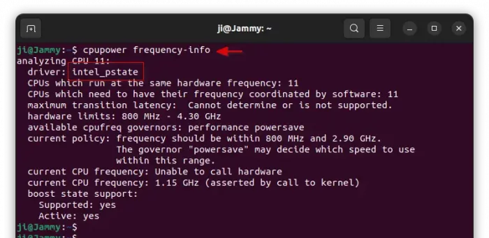 2. Then, you may run command to check which scaling driver is in use, minimum and maximum CPU frequency supported by your hardware, etc information.