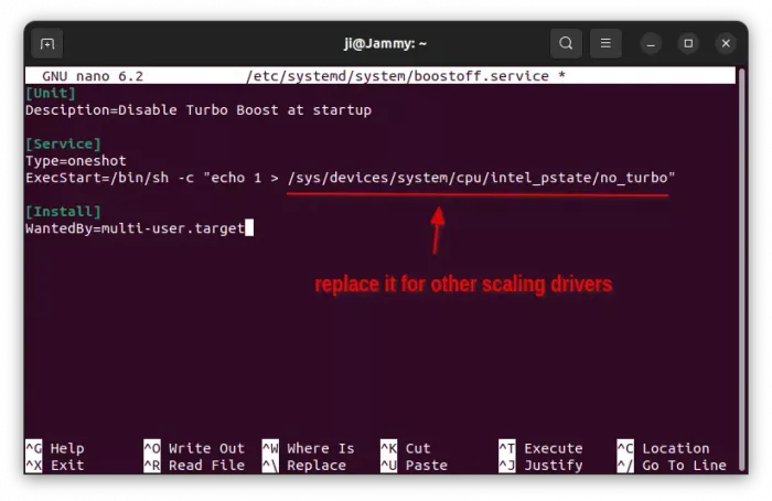 NOTE: for non-intel_pstate driver, use /sys/devices/system/cpu/cpufreq/boost instead of the bold text of ‘ExeStart’ value.