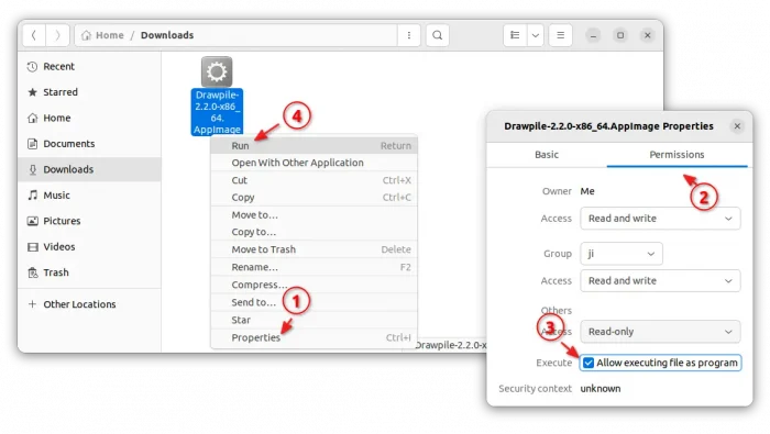 Just grab the package, add executable permission in file ‘Properties’ dialog (under Permissions tab), then user can click ‘Run’ AppImage to launch the program.