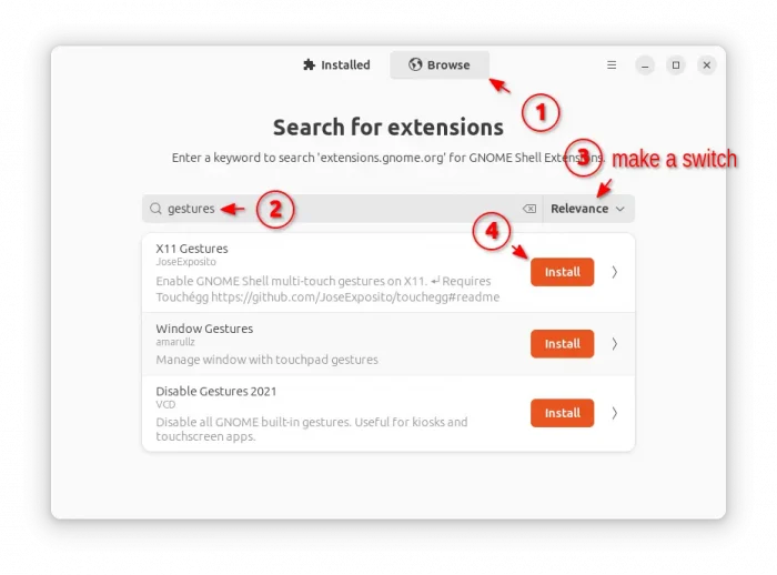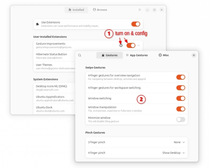 Finally, use Extension Manager (install it from App Center filtered by “Debian package”) to enable and configure the extension for improved gestures.