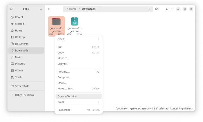 2. Then, extract the archive in your Downloads folder. Right-click on the extracted folder and select “Open in Terminal” to open up a terminal window with that folder as working directory.