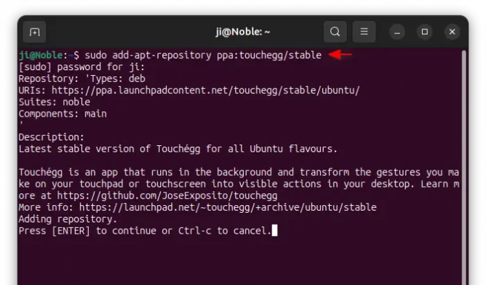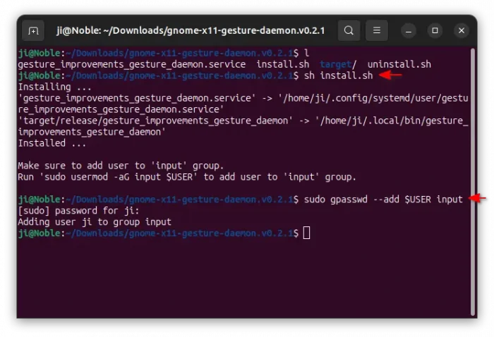 If everything’s done without any error, restart computer. The extension then will make multi-touch gestures work for GNOME on Xorg session.