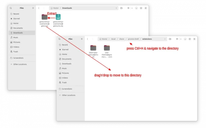 Then, open file manager and extract the Zip archive. Finally, copy or move the extracted folder to .local/share/gnome-shell/extensions directory.