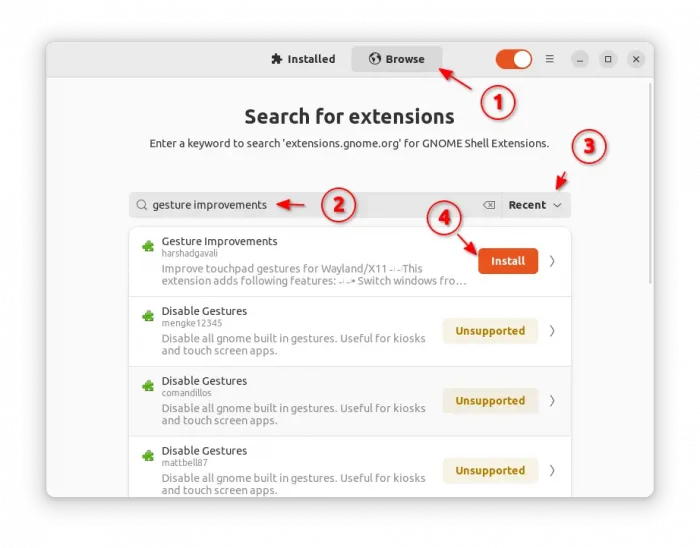 Then, launch “Extension Manager”, and use it to search & install “Gesture Improvements” extension under Browse tab.