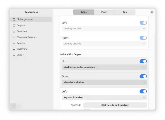 • Gesture Improvements extension (GNOME only) – enable 4-finger swipe and pinch gestures, support both Xorg and Wayland.