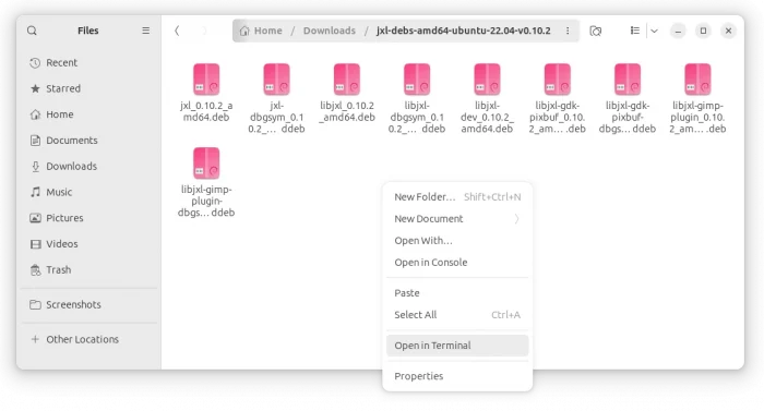 For choice, you may just install ‘libjxl_x.x.x_amd64.deb’, ‘libjxl-gdk-pixbuf_x.x.x_amd64.deb’, and ‘libjxl-gimp-plugin_x.x.x_amd64.deb’ as the screenshot below shows you.