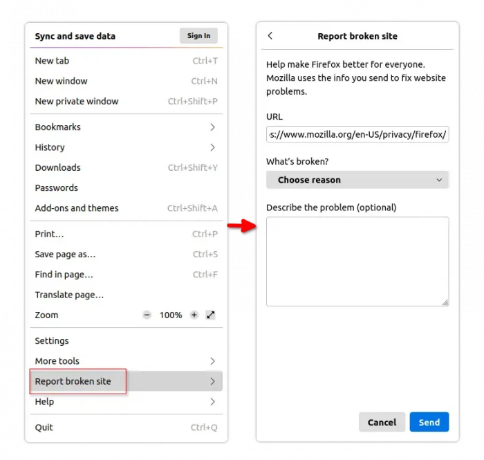 Firefox 123.0 also added a new menu option to easily report web compatibility issue for currently tab.