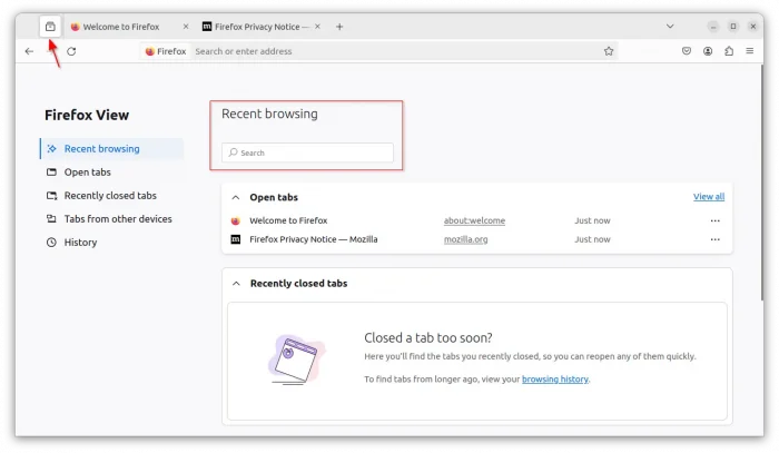 In the new monthly release, Firefox View page now have “Search” function, allows to search a page from each tab of recent browsing, recent closed tabs, open tabs, tab from other devices, and history.