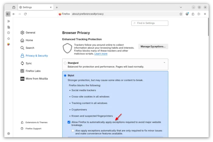According to the Github releases page, Firefox 142.0 added new ETP stick mode options to automatically apply required exceptions to avoid website breakage. Exceptions are split into baseline (core functionality) and convenience (extra features). And, it’s also available when working in ETP Custom mode.