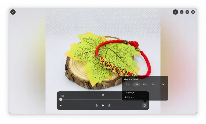 And a seek bar in bottom with play/pause, seek forward/backward, volume control, and settings for playback speed, language and subtitles.