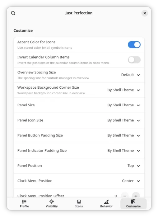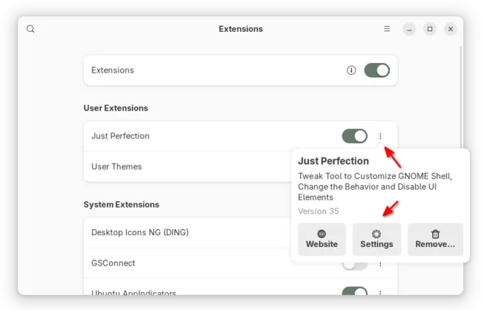 Finally, use either GNOME Extensions or Extension Manager to open Just Perfection preferences page to tweak your desktop.
