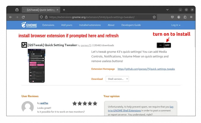 Or, go to the extension page in web browser, then use the ON/OFF switch to install. If you don’t see the toggle switch, click the link in the page to install browser extension and refresh.