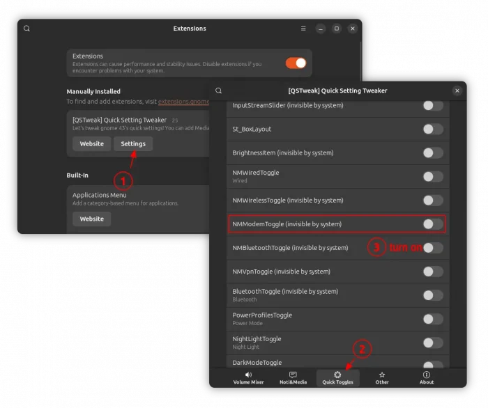 Finally, launch either GNOME Extensions app or Extension Manager (both available in Gnome Software, Ubuntu Software). Click the settings button for “Quick Setting Tweaker” extension. Navigate to “Quick Toggles” tab, and turn on any toggle switch to hide from upper right menu.