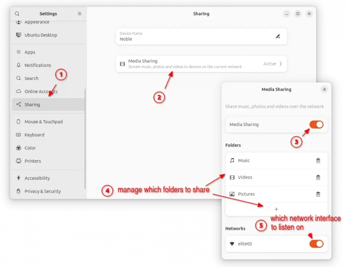 For the default GNOME desktop, just open Settings, then just turn off the toggle switch under “Sharing -> Media Sharing”.