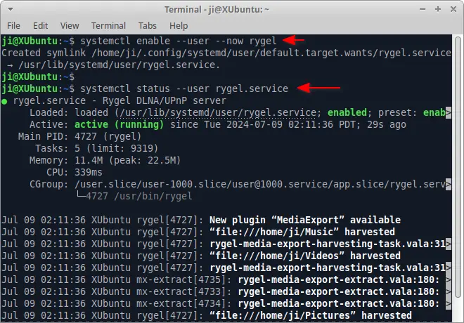 Next, every time after made changes to the ~/.config/rygel.conf file, you need to restart the service by running the command below to apply.