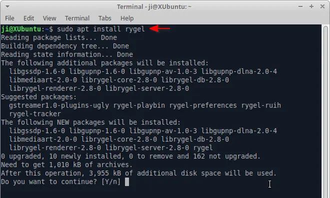 1. First, run command to install the rygel media server as well as its dependencies.: