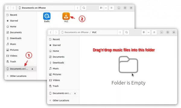 In my case, it’s a phone icon with text “Document on iphone”. In that folder, click VLC icon. Finally, drag’n’drop your music files into the VLC sub-folder.