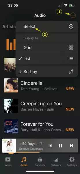 First, navigate to “Songs” tab in VLC. Then, tap top right “circle with 3 dots” icon, and click “Select” to choose all the files.
