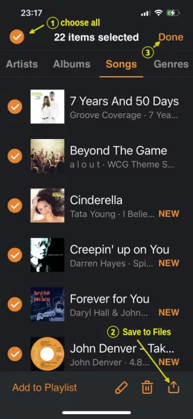 Finally, use the bottom right icon to open menu to “Save to Files” for all selected music files.