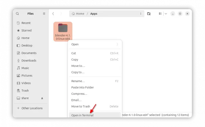 To do so, first move the extracted folder to another location for long time use. In my case, I created an Apps folder in user home, then move the Blender folder into it!