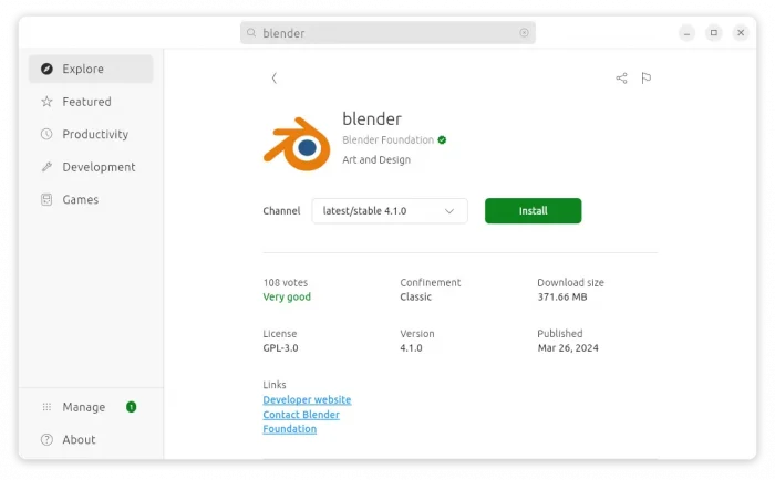 The Snap package automatically receive updates! If a newer version of the 3D creation software is out, and you can’t wait for the auto-update, then, run command instead to update manually: