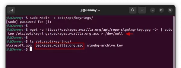wget -q https://packages.mozilla.org/apt/repo-signing-key.gpg -O- | sudo tee /etc/apt/keyrings/packages.mozilla.org.asc > /dev/null