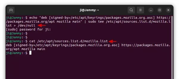 When done, you may verify by running cat /etc/apt/sources.list.d/mozilla.list to print the source file content.
