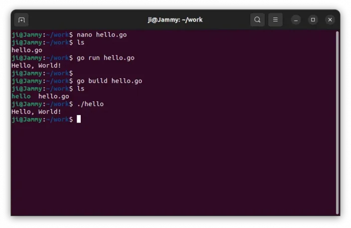 Then, either use go run hello.go command to run it. Or go build hello.go to build into a binary file.