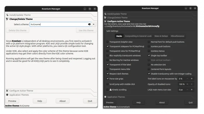 The changes apply immediately in the “Kvantum Manager” app window, but other Qt apps need a restart to apply.