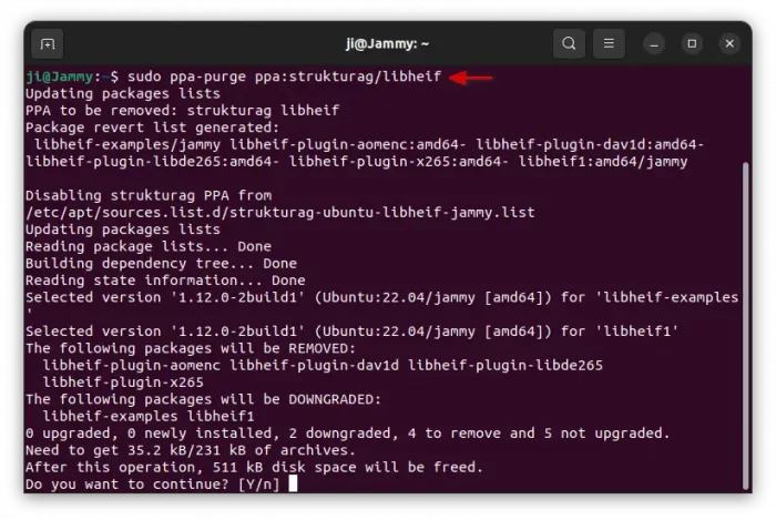 Tips: the ppa-purge may fail if you did something to PPA or the installed packages before purging. In the case, try installing synaptic package manager (from Ubuntu Software), then use it to search & force libheif1 package to old version (select the package, then press Ctrl+E).